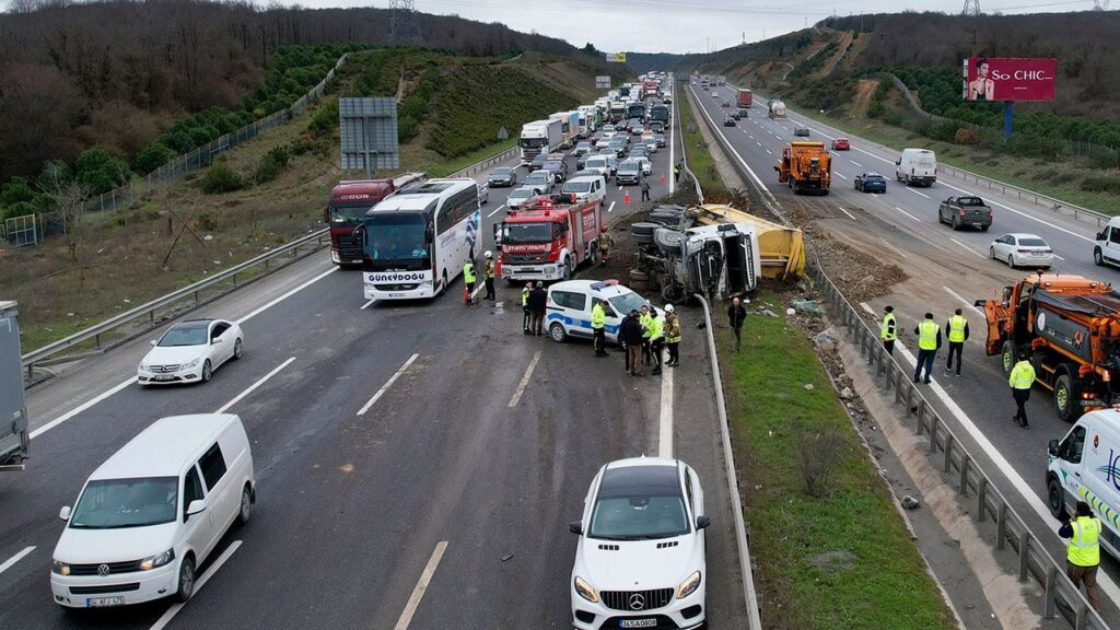İstanbul’un Arnavutköy İlçesi’nde Kuzey Marmara Otoyolu’nun Fenertepe gişeleri mevkiinde sürücüsünün kontrolünden çıkan hafriyat kamyonu yan yattı. Kaza nedeniyle otoyolun Ankara